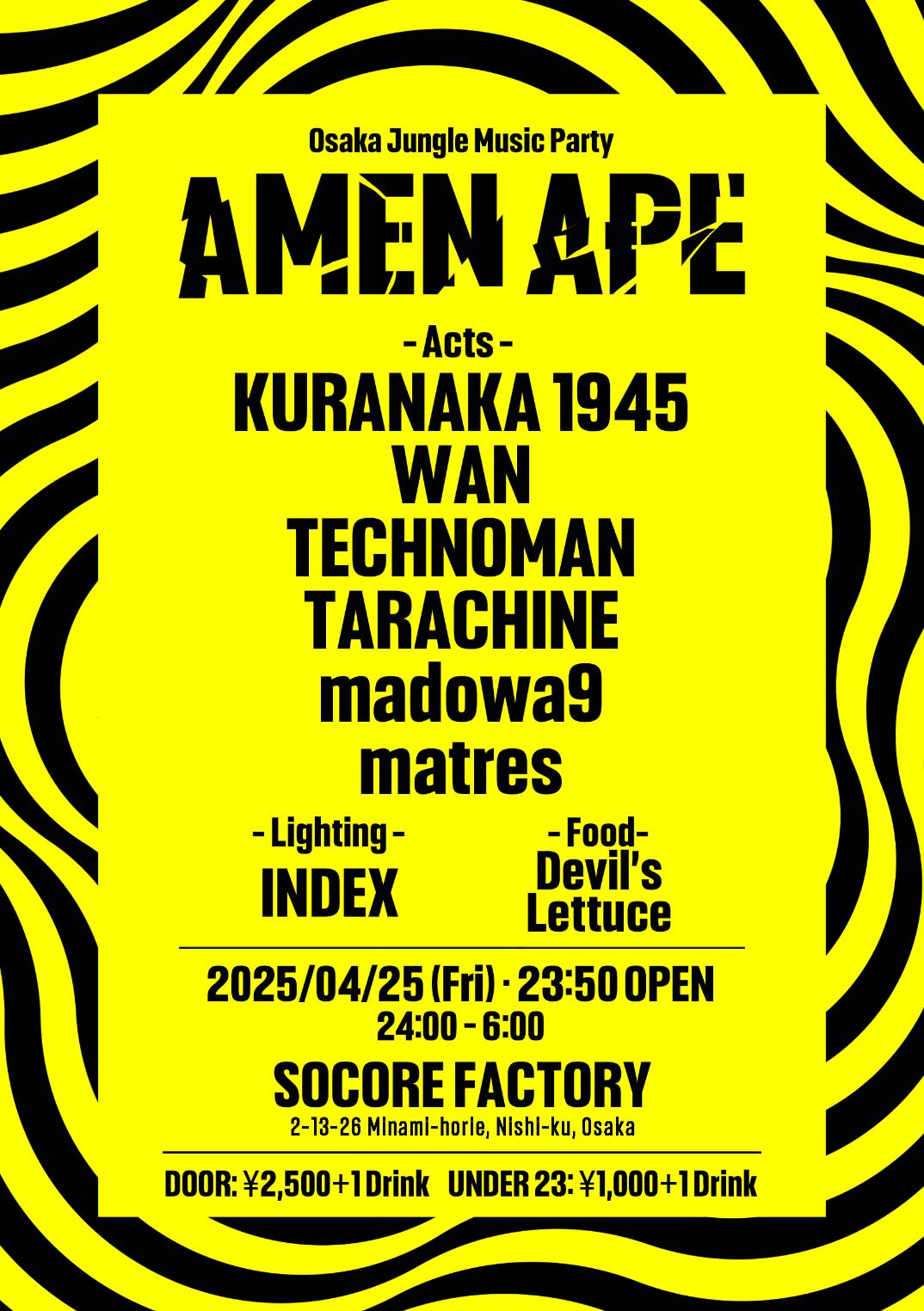 UK発Rave Soundが注目される昨今、Rave Musicを代表する一ジャンルであるJungleを大阪で目一杯楽しみ共有できるコミュニティを作るべく始動したAmen Apeも4回目を迎える。