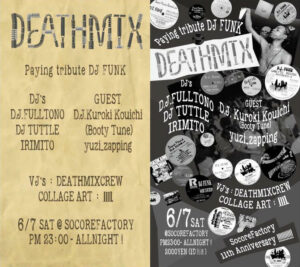 SOCORE FACTORYの11周年記念月に、大阪の新しい音やグルーヴ、ダンスフロアの在り方を常に提唱してきた”DEATHMIX”が開催決定!!