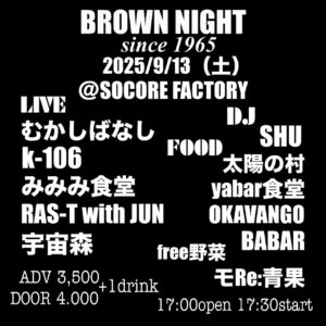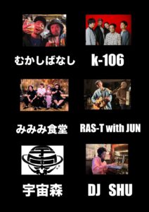 Act:■LIVE むかしばなし k-106 みみみ食堂 RAS-T with JUN 宇宙森 ■FOOD 太陽の村 yabar食堂 OKAVANGO BABAR ■DJ SHU ■free野菜 モRe:青果