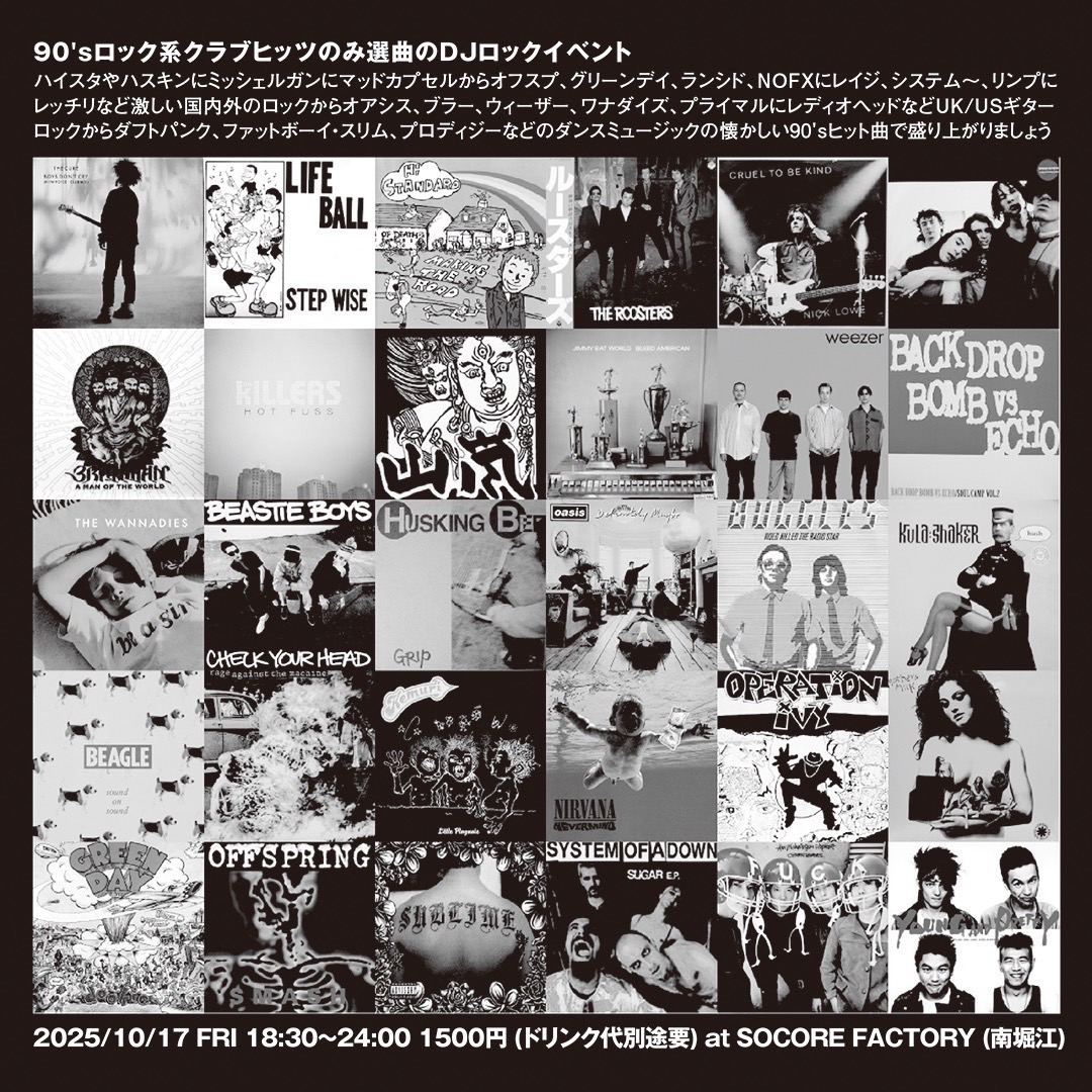 ハイスタやハスキンにミッシェルガンにマッドカプセルからオフスプ、グリーンデイ、ランシド、NOFXにレイジ、システム〜、リンプにレッチリなど激しい国内外のロックからオアシス、ブラー、ウィーザー、ワナダイズ、プライマルにレディオヘッドなどUK/USギターロックからダフトパンク、ファットボーイ・スリム、プロディジーなどのダンスミュージックの懐かしい90’sヒット曲で盛り上がりましょう