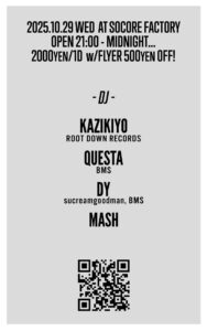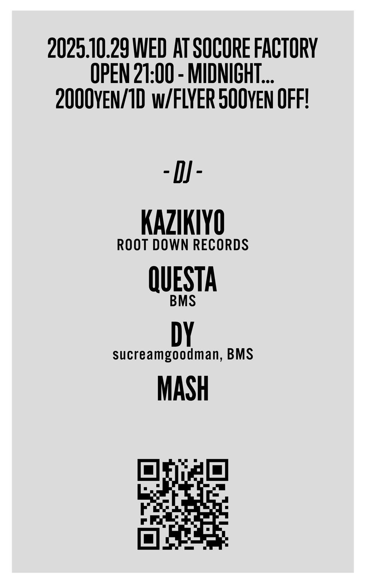 Act:■DJs KAZIKIYO (ROOT DOWN RECORDS) QUESTA(BMS) DY (BMS / sucreamgoodman) MASH