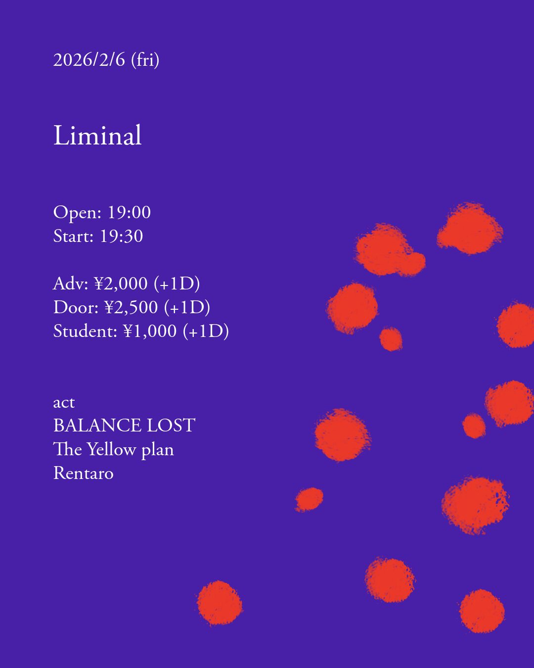 Open:19:00 / Start:19:30 / Adv:¥2,000 (D別) / Door:¥2,500 (D別)
