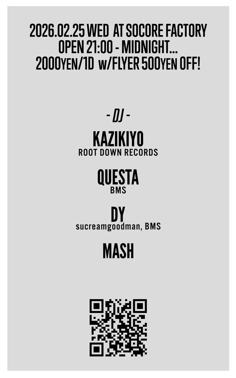 Act:■DJs KAZIKIYO (ROOT DOWN RECORDS) QUESTA(BMS) DY (BMS / sucreamgoodman) MASH